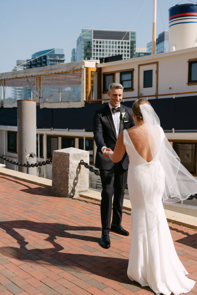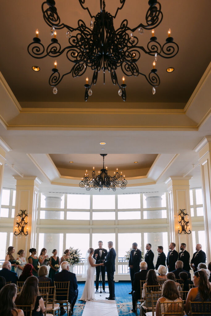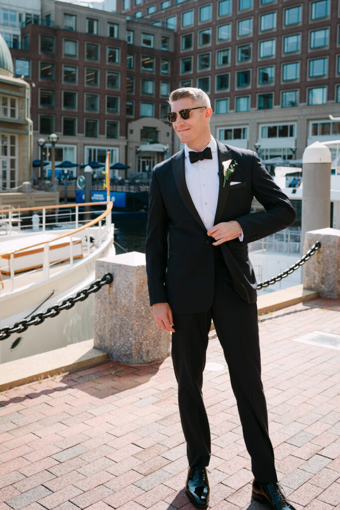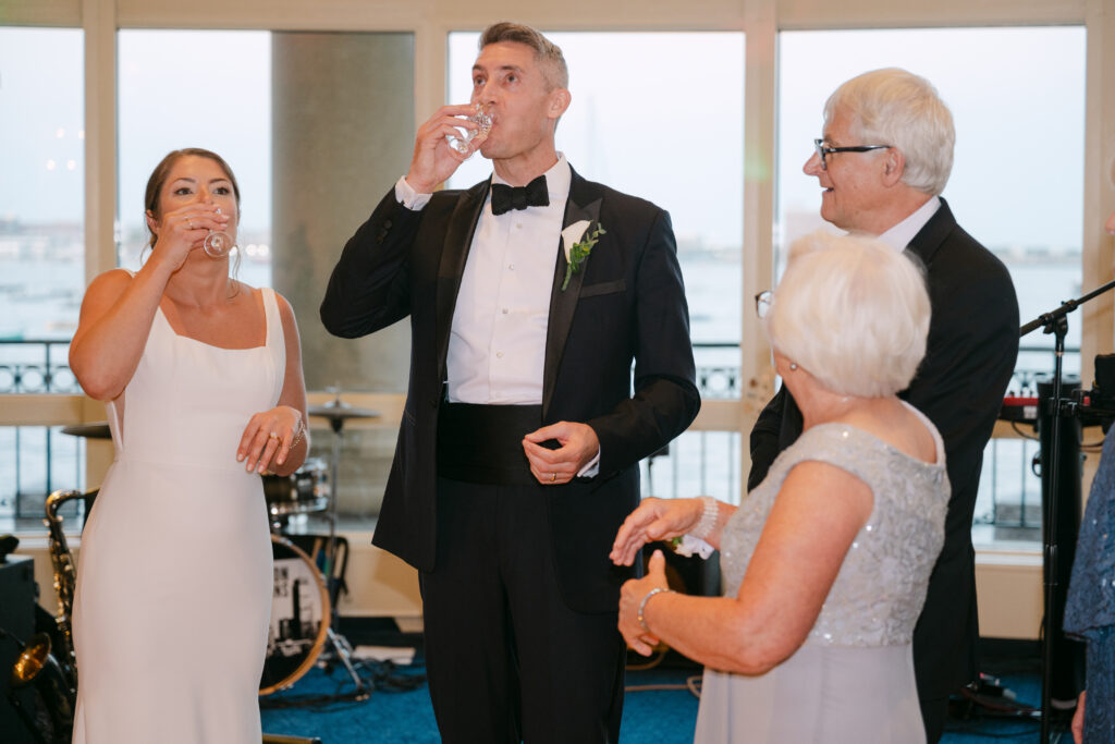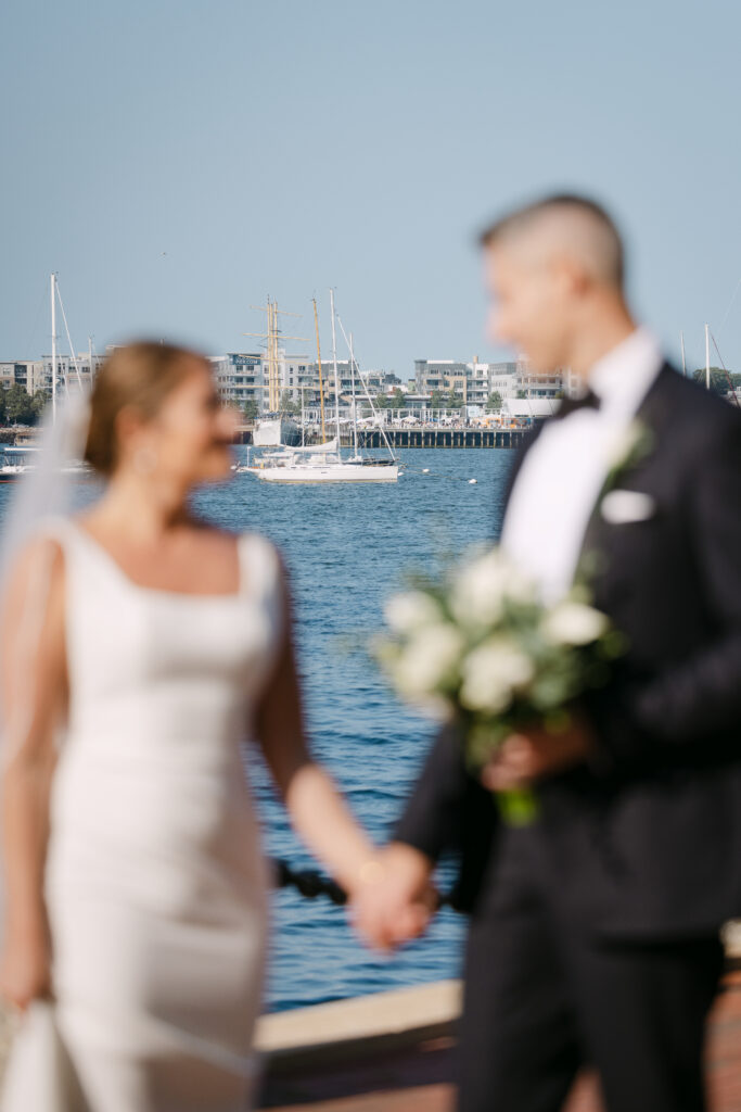 Their day started with getting ready and their first look at the harbor. The ceremony took place inside the hotel’s stunning event space, with the harbor glittering through the floor-to-ceiling windows behind them.