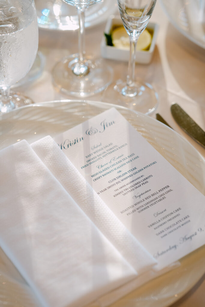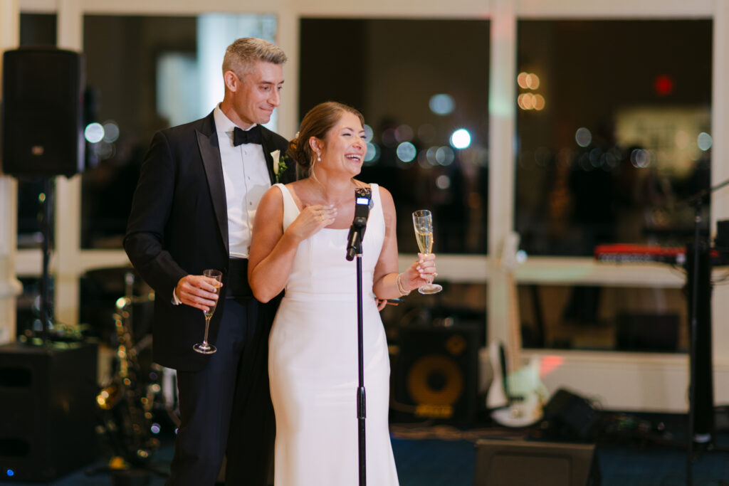 The reception in the Wharf Room was everything — crisp white linens, simple and classic floral arrangements, and those gorgeous harbor views as the backdrop. Kristin and Jim took a moment at the mic to welcome their guests, and the joy on their faces said everything. The night was full of laughter, toasts, and dancing… exactly what a wedding should be.