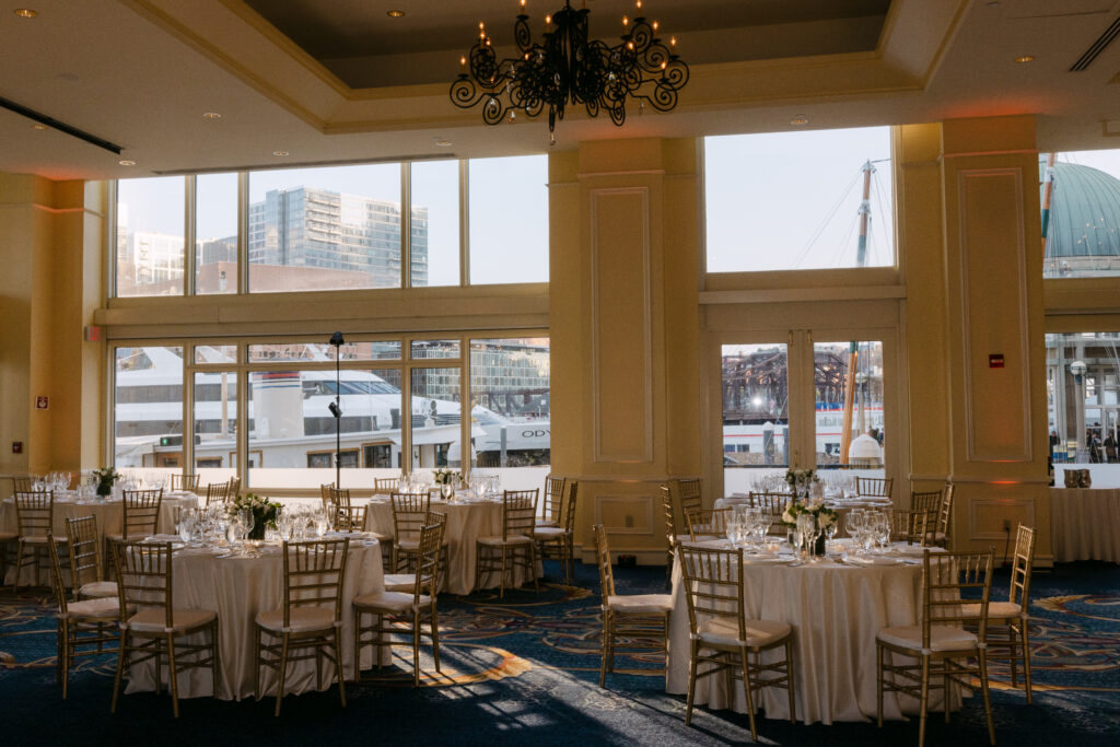 The Wharf Room is the grand ballroom of the property with 19-foot ceilings, glittering chandeliers, and three walls of floor-to-ceiling windows with harbor views. It accommodates up to 250 guests. This is where Kristin and Jim celebrated, and it was stunning — all that natural light flooding in from the water is a photographer’s dream.
